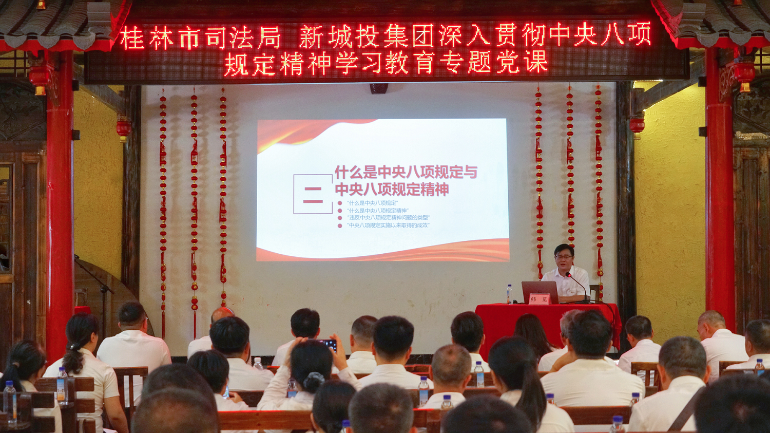 隨后,韓覓同志為全體人員講授了一堂專題黨課。以“深學篤行習近平總書記關于加強黨的作風建設的重要論述 持續(xù)擦亮中央八項規(guī)定‘金色名片’以作風建設新成效推動司法行政工作和國有企業(yè)內(nèi)控高質(zhì)量發(fā)展”為題,圍繞“為什么要強調(diào)作風建設,什么是中央八項規(guī)定與中央八項規(guī)定精神,如何開展好深入貫徹中央八項規(guī)定精神學習教育”三個方面,重點闡述了“為什么、是什么、怎么做”,進一步增強了黨員干部紀律意識和規(guī)矩意識,對切實改進工作作風具有很強的指導意義。